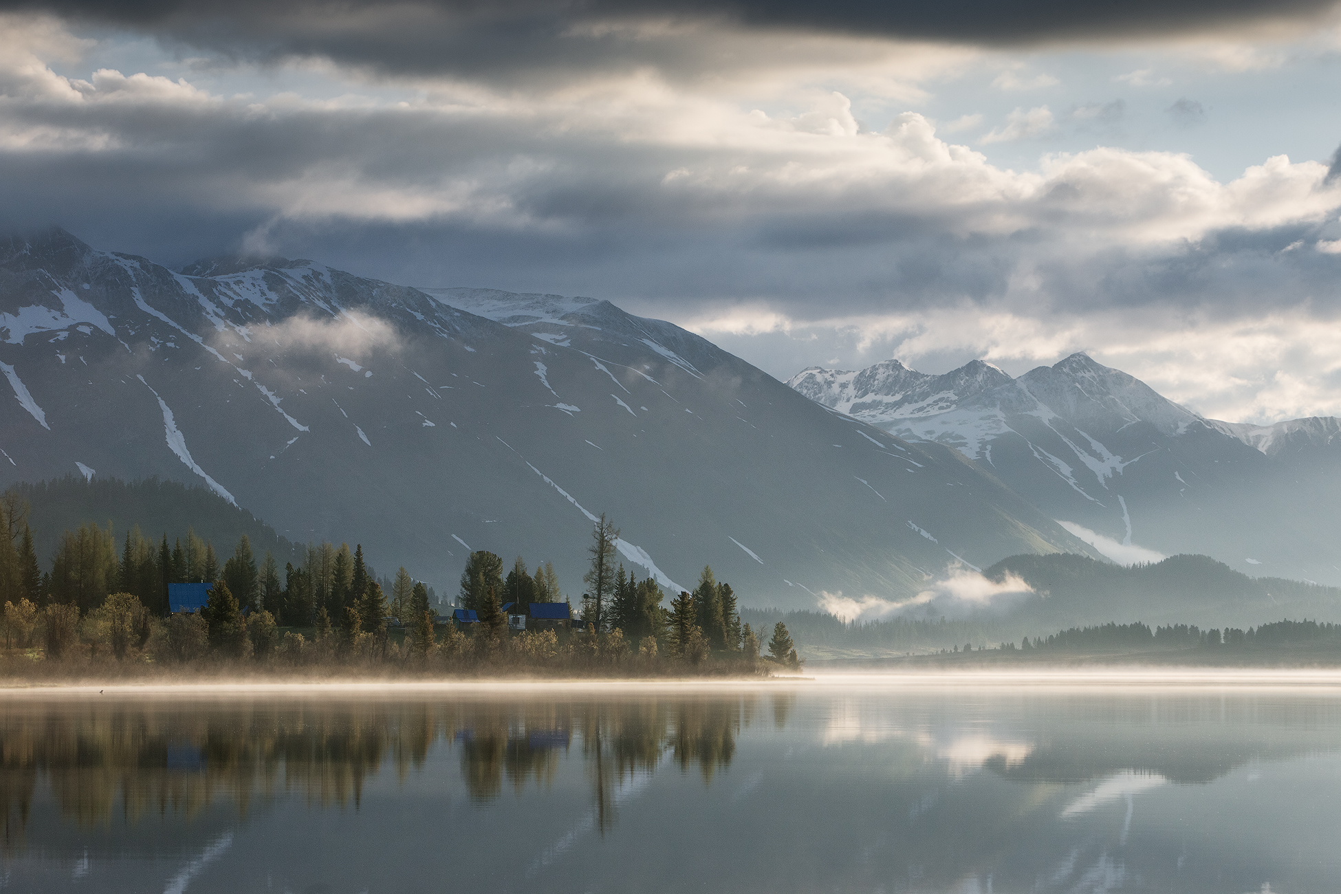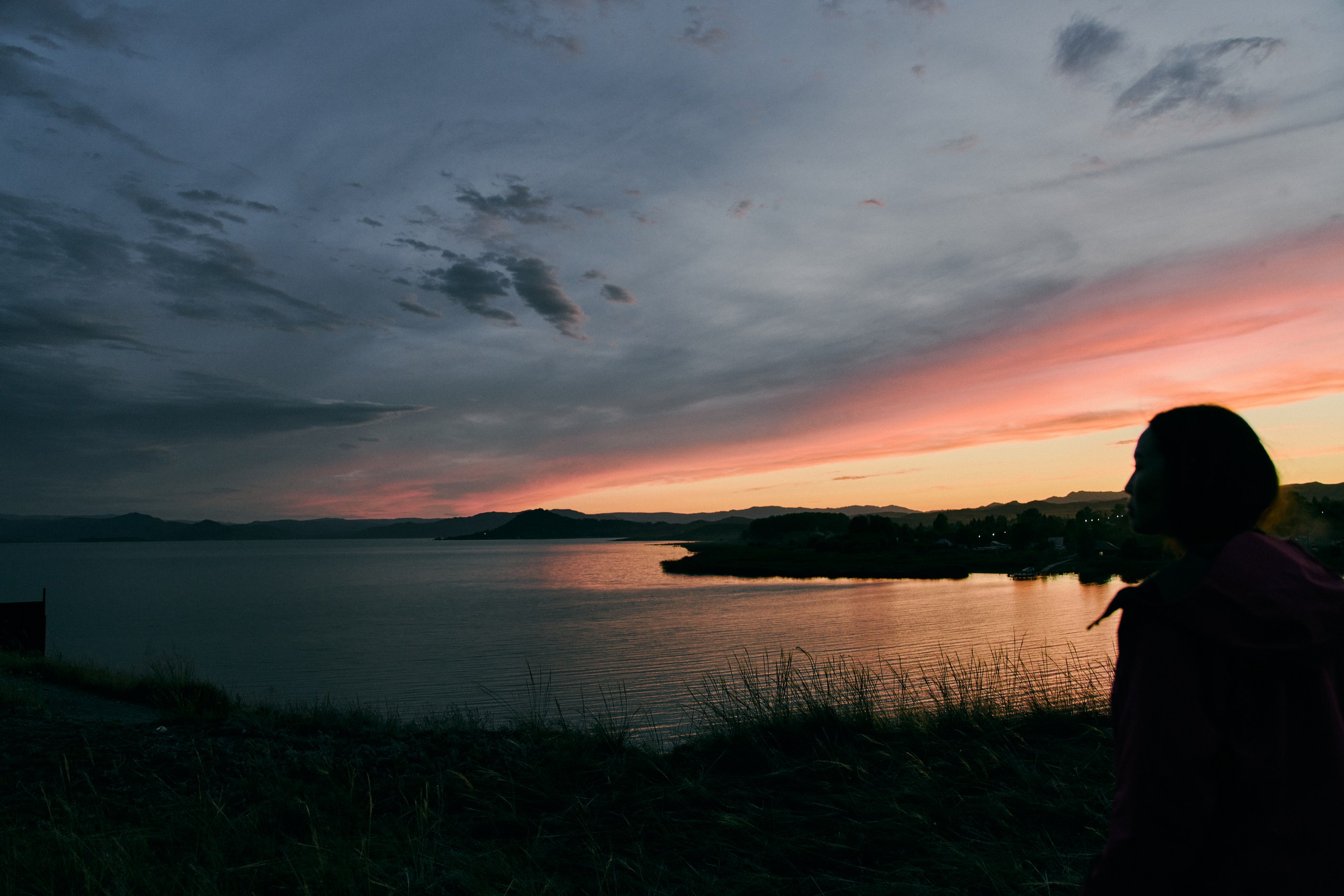 We meet the sunset on the road at one of the panoramic viewpoints. At dusk, we arrive at a guest house located on the shore of the Bukhtarma Reservoir, in a quiet and secluded bay.